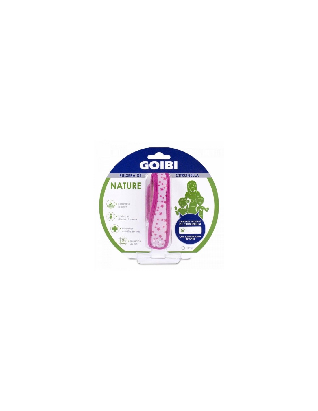 La pulsera Goibi de citronela es ideal para toda la familia, su radio de difusión es de 1 metro. Resistente al agua. Contiene dos recambios que permiten una duración de 30 días. Probada científicamente. Indicada para niños mayores de 3 años y adultos. Lleva incorporado un identificador infantil.