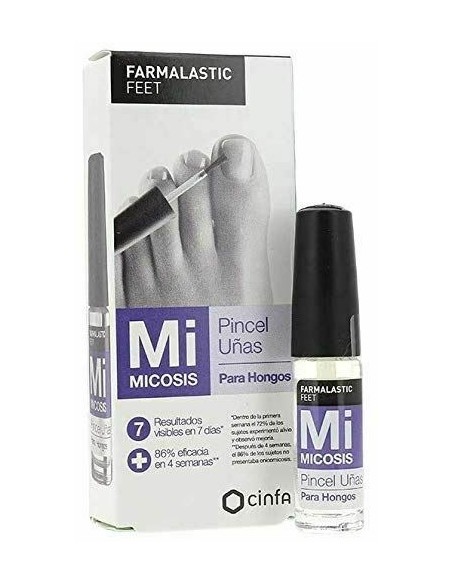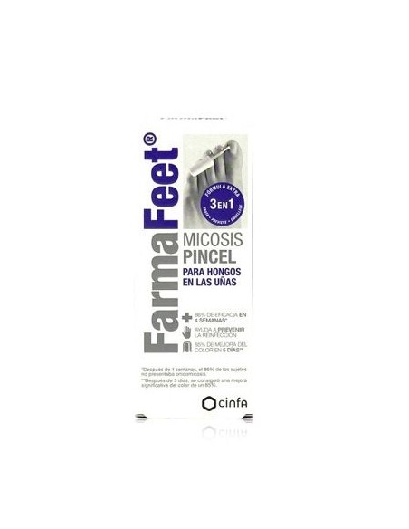 El producto sanitario Farmafeet Micosis Pincel para hongos en las uñas 3 en 1 ayuda a tratar y prevenir las infecciones por hongos en las uñas y a reducir la decoloración provocada por la infección. Su combinación de ingredientes activos que penetra totalmente en la uña crea un entorno desfavorable para la onicomicosis. Además, su uso continuado hasta el crecimiento total de la uña previene frente a nuevas infecciones.