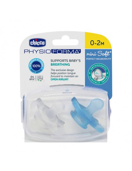 El Physio MiniSoft Azul-Transparente 0-2 m de Chicco, su suave material de silicona no deja marcas en la carita del bebé, deja libre la nariz y la barbilla, y además no contiene sabor, olor ni se deforma con el tiempo.