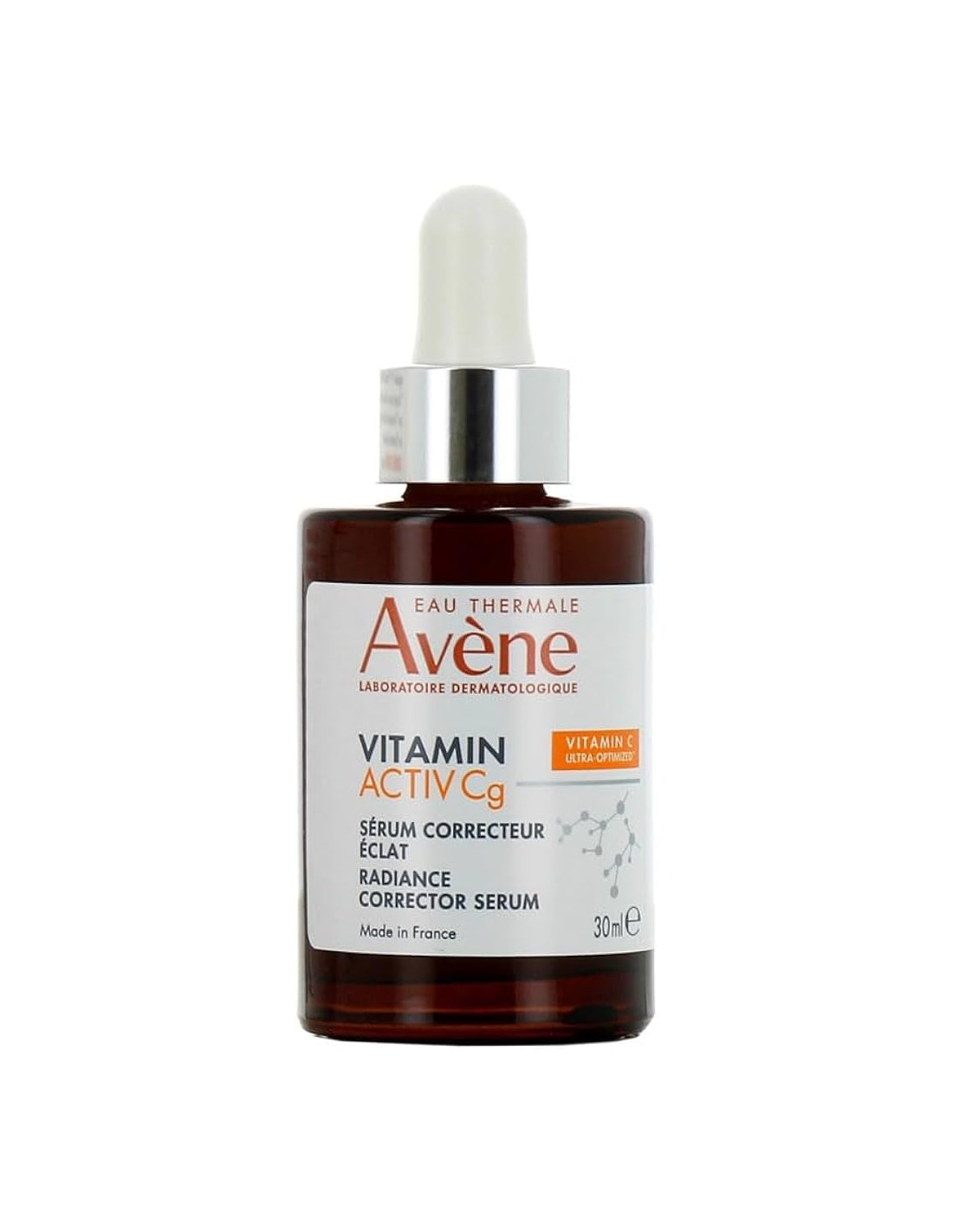El sérum corrector iluminador Vitamina Activ Cg es un cuidado probado en pieles sensibles, que contiene un 94 % de ingredientes de origen natural, sin ingredientes de origen animal, en un frasco de cristal con pipeta.