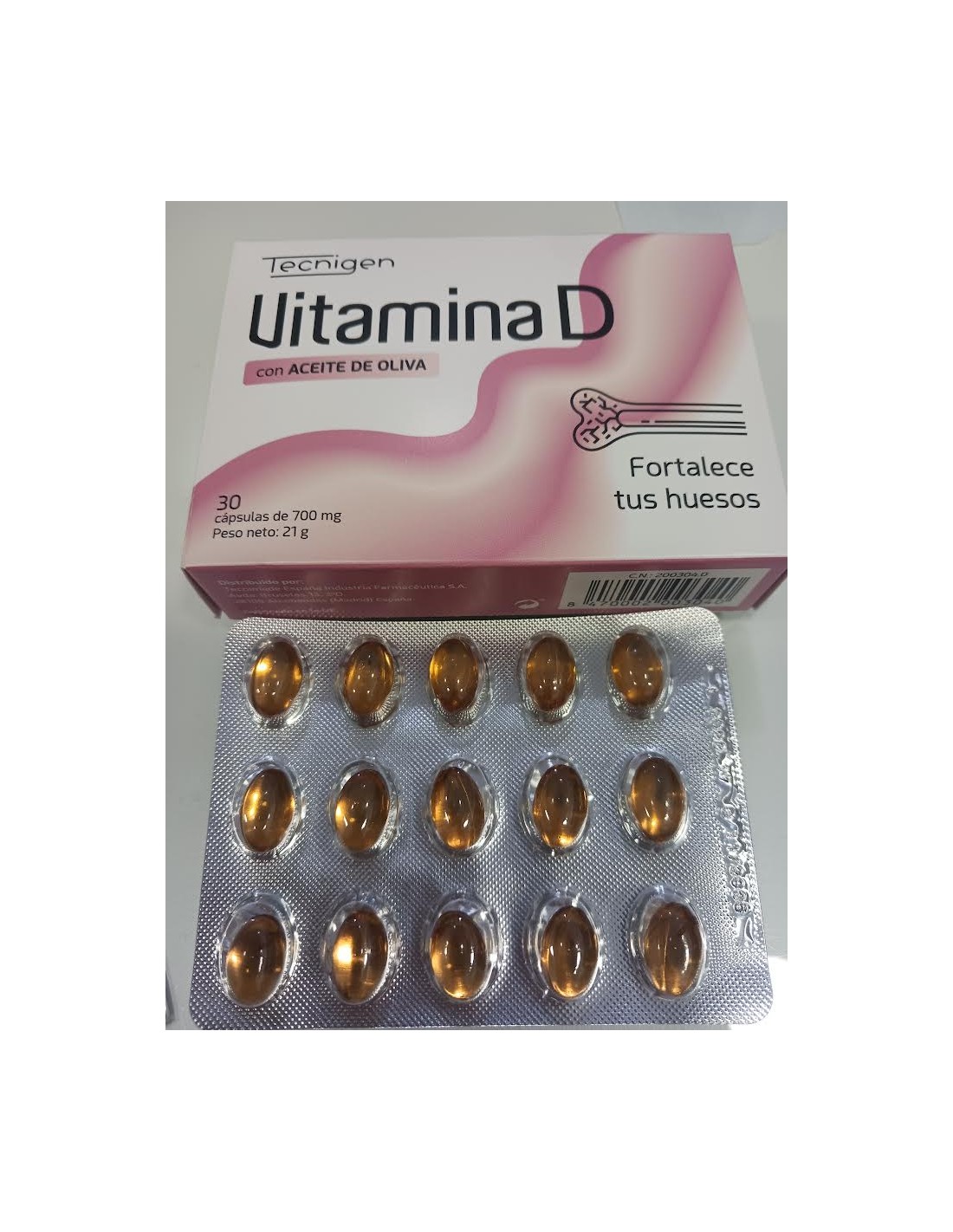 Tecnimede Tecnigen OTC Vitamina D es un complemento alimenticio desarrollado por la empresa Tecnigen para aportar un incremento de nutrientes esenciales para el mantenimiento de los huesos en el cuerpo humano. Formulado a partir de una concentración alta de colecalciferol y aceite de oliva. Está libre de gluten, por lo cual puede ser ingerido por personas celiacas. Tampoco contiene derivados lácteos, por lo que es apto para individuos intolerantes a la lactosa. Posee 2 excipientes que ayudan a mantener la cápsula en buen estado, ellos son agua y glicerol, los cuales aportan humedad. Están recubiertos de gelatina, por lo que no se recomienda mantenerlos en contacto con la luz solar o fuentes de calor.