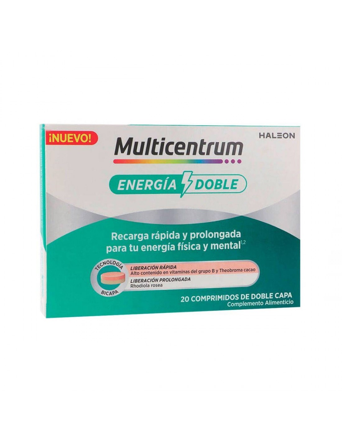 Multicentrum Energía Doble 20 Comprimidos es un complemento alimenticio diseñado para combatir la fatiga y mejorar los niveles de energía de forma rápida y prolongada. Cada comprimido de doble capa combina vitaminas del grupo B con extractos de Theobroma cacao y Rhodiola rosea para ofrecer un soporte energético completo.