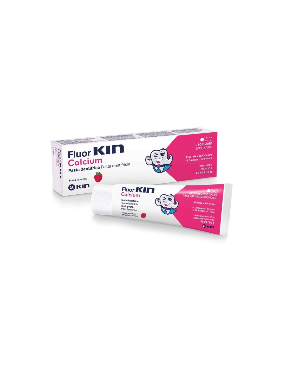 Protege y fortalece tus dientes con la pasta Fluor Kin Calcio sabor fresa. Previene la caries y remineraliza el esmalte.