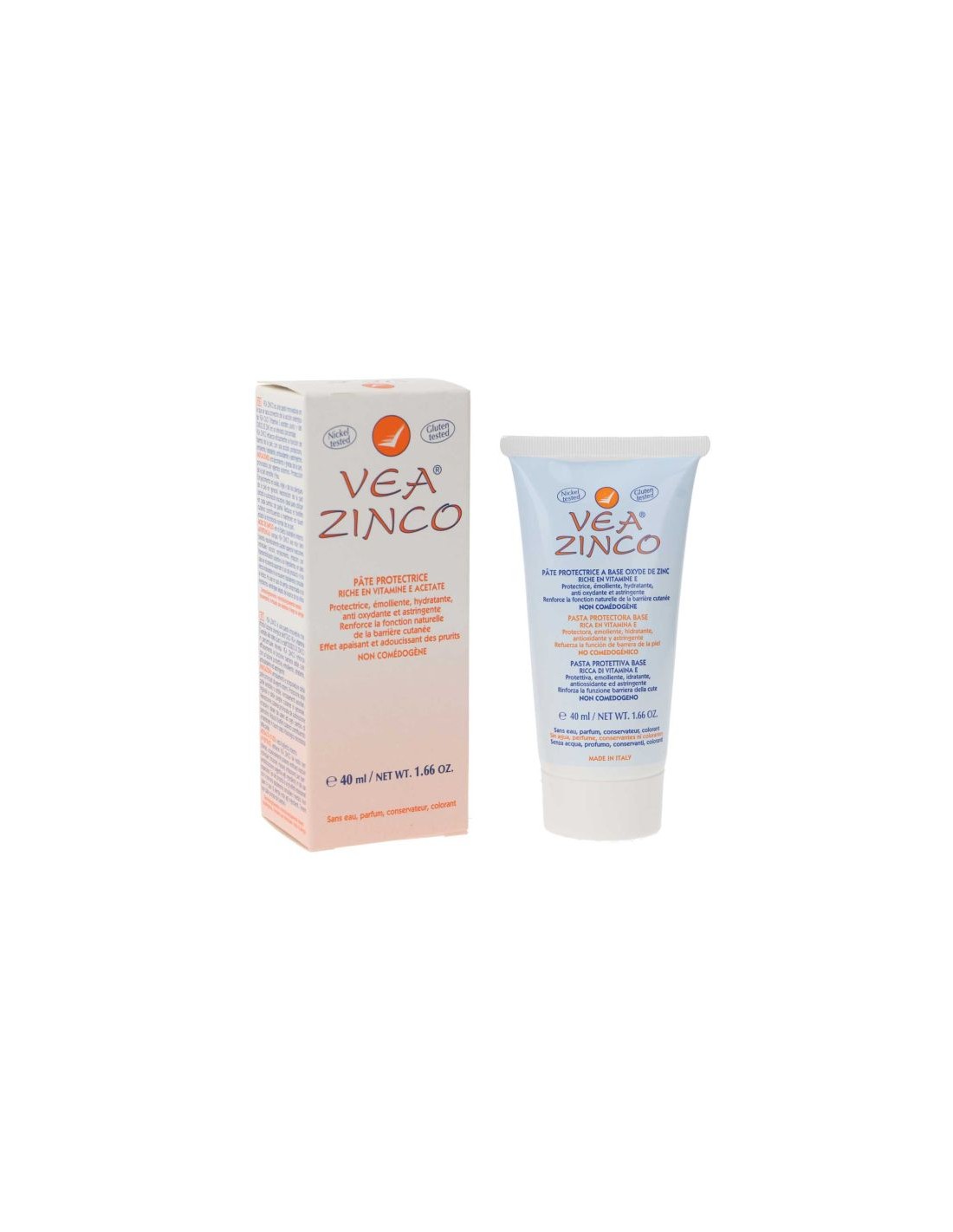 Vea Zinco es una pasta innovadora que conjuga la acción del Vea Olio (Vitamina E acetato pura) y la del óxido de zinc en elevado porcentaje (30%).
