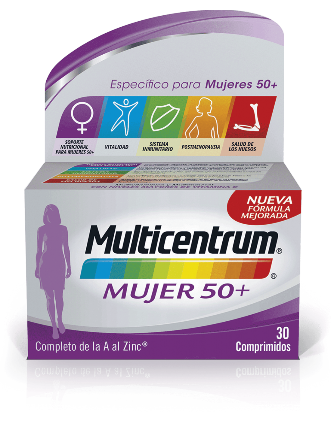Fórmula con 13 vitaminas y 11 minerales para mujeres a partir de los 50 años Hemos mejorado nuestras fórmulas y ahora tenemos un alto contenido de VITAMINA D[*] para el mantenimiento de los huesos en condiciones normales Con cantidades de vitaminas y minerales que ayudan a hacer frende a los cambios en las necesidades nutricionales tras la menopausia