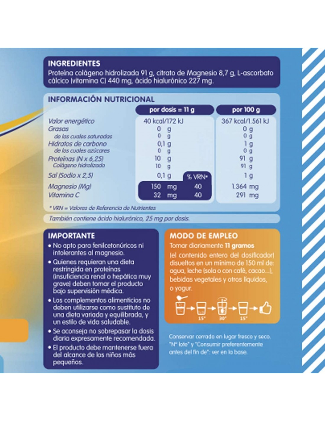 Proteína colágeno hidrolizada 91 g, citrato de Magnesio 8,7 g, L-ascorbato cálcico (vitamina C) 440 mg, ácido hialurónico 227 mg.