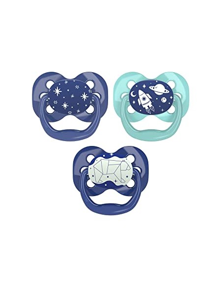 Dr Brown's Chupete PreVent Nocturno 0-6 Meses 2 Unidades Azul: promueve el correcto desarrollo de la cavidad oral. Diseñado por el dentista pediátrico, Dr. Davis para minimizar la presión dentro de la boca del bebé. Esa presión puede crear problemas dentales como la mordida cruzada. El estudio determina que la presión en el paladar podría ser reducida creando un canal que permita el paso del aire, para eliminar el afecto ventosa cuando el bebé succiona, reduciendo la presión en el paladar al permitir el paso del aire, aumenta así el confort.