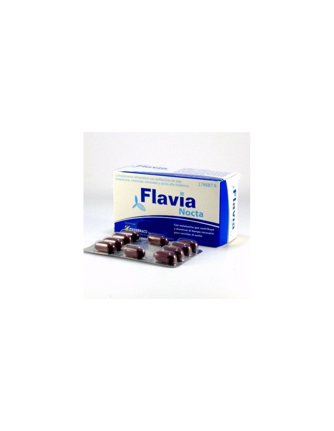 Flavia Nocta es un complemento alimenticio que asocia extracto de soja (40% de isoavonas de soja), melatonina, vitaminas (ácido fólico, vitamina D, vitaminas B6 y B12), minerales (calcio, magnesio) y ácido alfa-linolénico. Flavia Nocta está formulado para cubrir los requerimientos nutricionales de la mujer durante la menopausia en aquellas situaciones en las que sea necesario complementar la dieta normal.