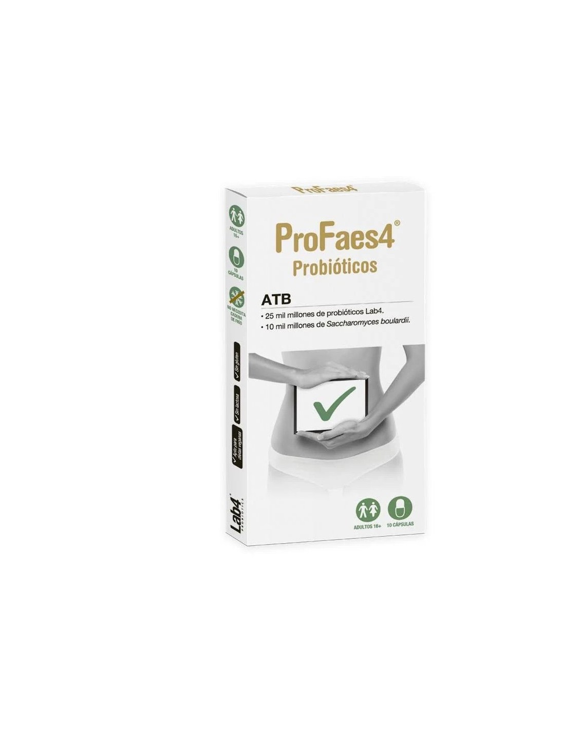 ProFaes4 ATB está elaborado con 25 mil millones de bacterias viables del Consorcio Lab4 y 10 mil millones de Saccharomyces boulardii (por cápsula).