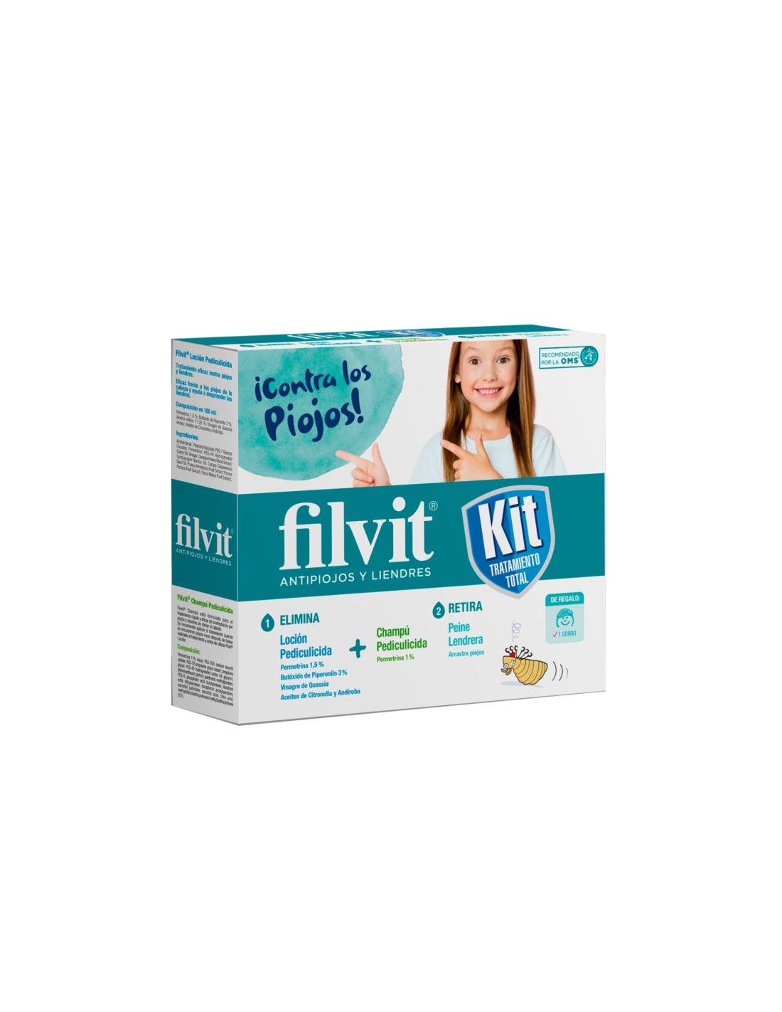 Doble acción combinada contra los piojos. Con Filvit Loción antiparasitaria pediculicida con Malatión 0,5%. Solución concentrada que elimina piojos y liendres en una sola aplicación y Filvit Champú antiparasitario pediculicida con Permetrina 1%. Que limpia y cuida el cabello contra los piojos. Se presenta con un gorro de tratamiento, peine de mil púas arrastra piojos y un folleto explicativo.