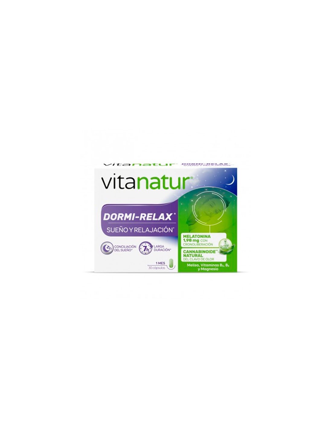 Vitanatur Dormi-Relax es un complemento alimenticio en cápsulas con una fórmula innovadora a base de melatonina que contribuye a disminuir el tiempo necesario para conciliar el sueño, extracto de melisa que contribuye a mantener la relajación y un buen descanso, extracto de clavo de olor, niacina (vitamina B3), vitamina B6 y magnesio que contribuyen al funcionamiento normal del sistema nervioso.